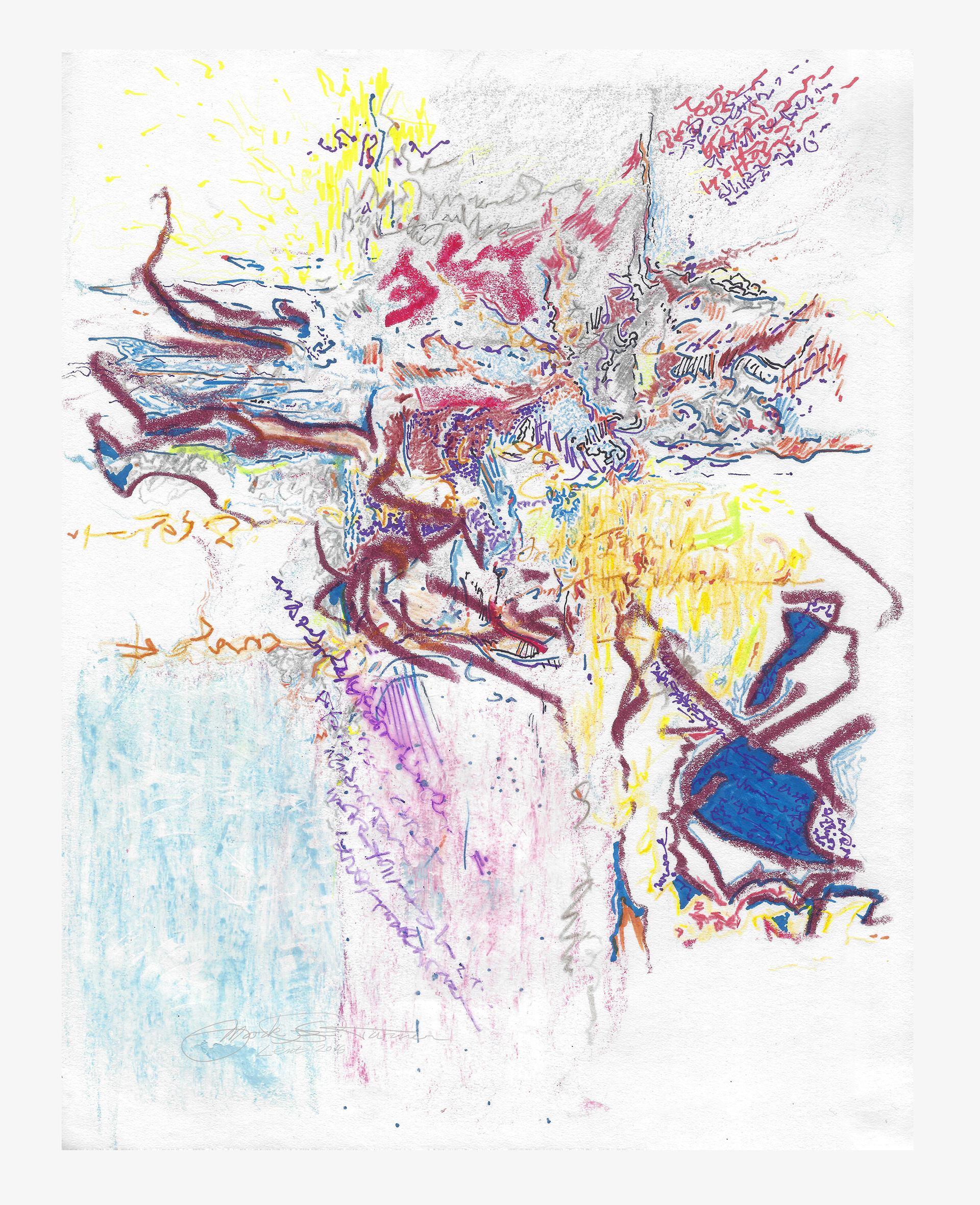 During a contemplative morning in the season of Lent, 2016, I was exploring asemic writing and autonomic drawing. So, the energy from my spiritual devotions motivated my pencils, pens and oil pastels. This composition is especially interesting to explore in close-up. Tell me what you discover there.